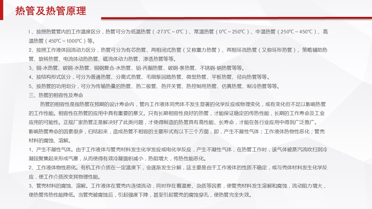 l 、按照熱管管內(nèi)的工作溫度區(qū)分,熱管可分為低溫熱管(-273℃~0℃)、常溫熱管(0℃~250℃)、中溫熱管(250℃~450℃)、高溫熱管(450℃~1000℃)等。
