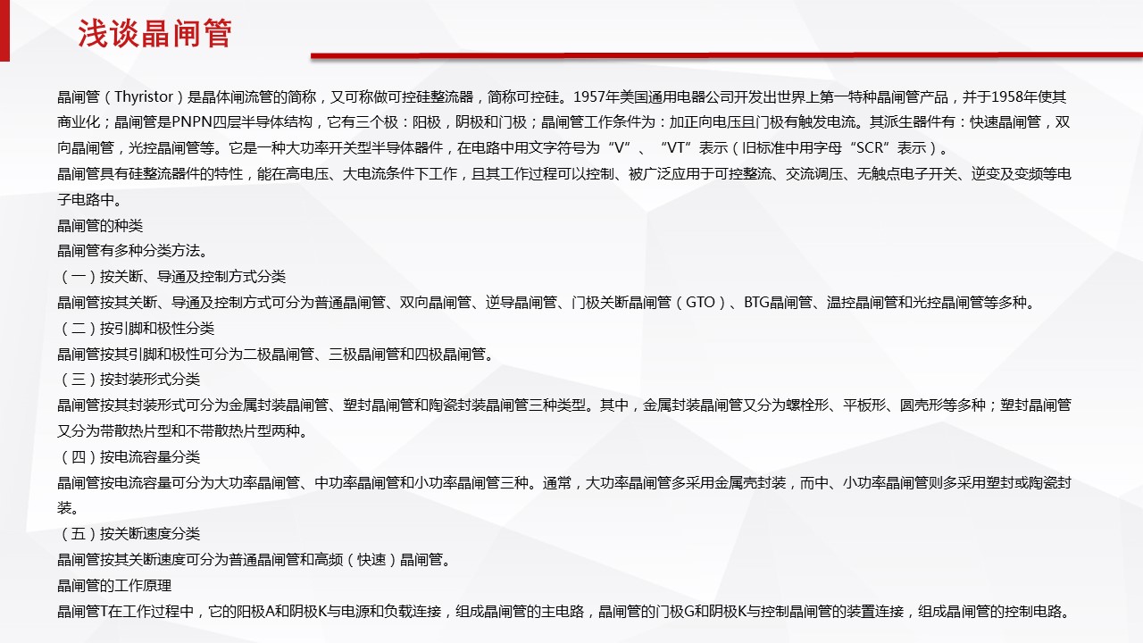 晶閘管按電流容量可分為大功率晶閘管、中功率晶閘管和小功率晶閘管三種。通常,大功率晶閘管多采用金屬殼封裝,而中、小功率晶閘管則多采用塑封或陶瓷封裝。