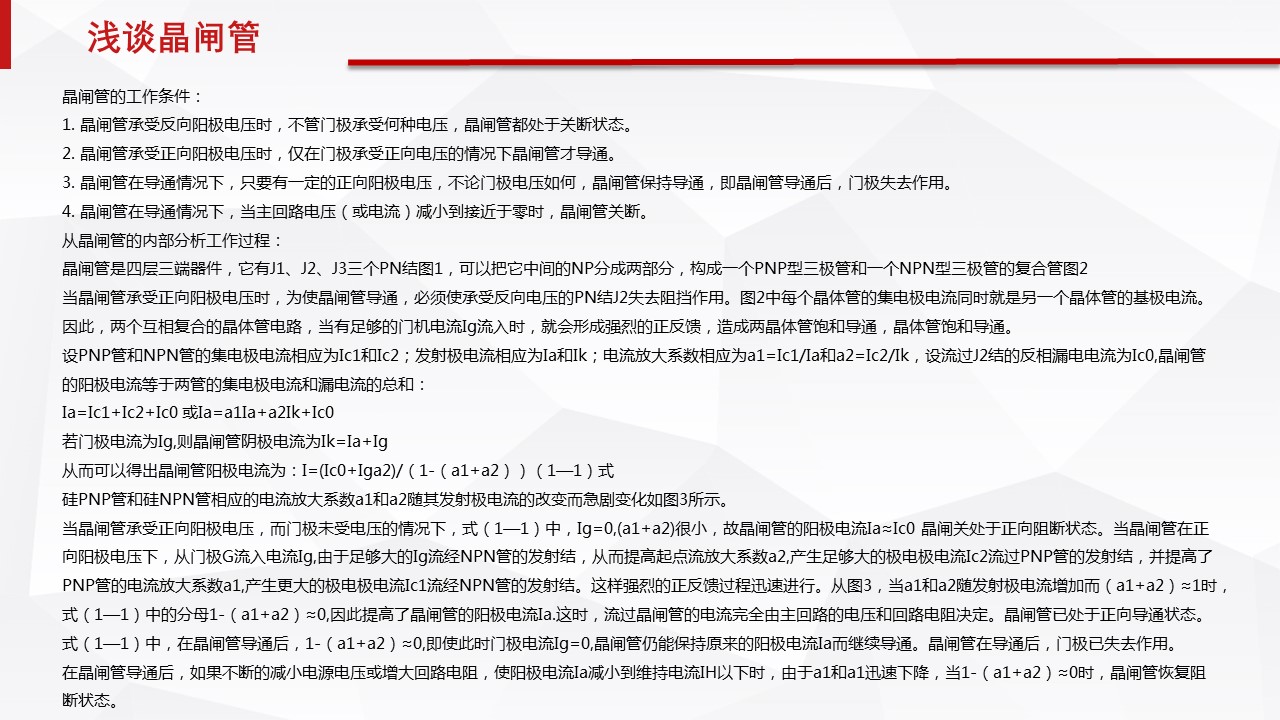 設PNP管和NPN管的集電極電流相應為Ic1和Ic2;發(fā)射極電流相應為Ia和Ik;電流放大系數(shù)相應為a1=Ic1/Ia和a2=Ic2/Ik,設流過J2結的反相漏電電流為Ic0,晶閘管的陽極電流等于兩管的集電極電流和漏電流的總和: